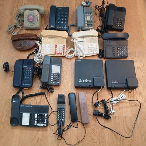3 bordtelefoner, 1 vegghengt telefon, 1 trådløs telefon og 1 sentralbordtelefon, type Mitel 6867i. Telefonsettet ble kjøpt nytt i 2019 og har blitt brukt frem til våren 2023 på et legekontor. Komplett for fem brukere. Alt fungerer. Selges grunnet overgang til nytt telefonisystem.