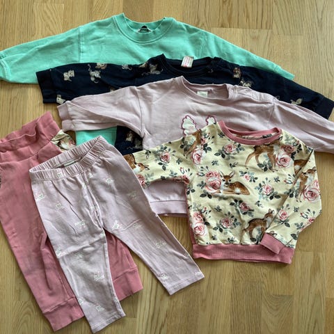 Klespakke størrelse 86. Pent brukt, fortsatt mye bruk igjen. Litt flekker på genseren med harepus.
