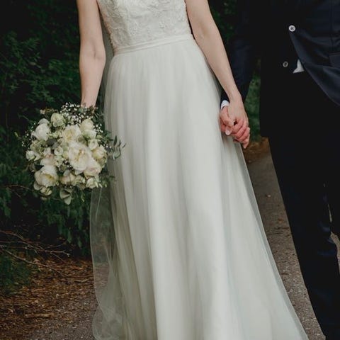 Renset sweetheart laceup brudekjole m/ slep og holde hempe i farge Ivory i str 42. Det er snøring bak på kjolen. Jeg er 152cm høy og brukte 11cm høye sko så kjolen er lagt opp ift dette. Brudekjole pose følger med - kjole selges for kr 6500