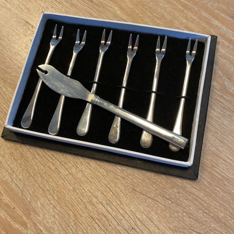 4 stk. retro gafler som passer til pålegg, oliven, ostepop, silde krukker m.m.