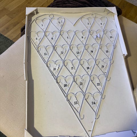 Moderne sammenleggbart kalendertre. Det er i en litt rustikk gullfarge, laget av metall. Brukes til å henge på vegg, og henge kalendergaver på. Praktisk å brette sammen og legge i boden. 100cm langt når det er utslått. Fra kremmerhuset, kun brukt til en stylingjobb.