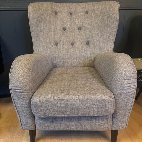 Lite brukt godstol i lysegrå ull-imitert stoff. Enkel å rengjøre, god å sitte i. Ben i eik. Mulighet for kjøp av to (kr 2 500,-). Må hentes.