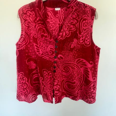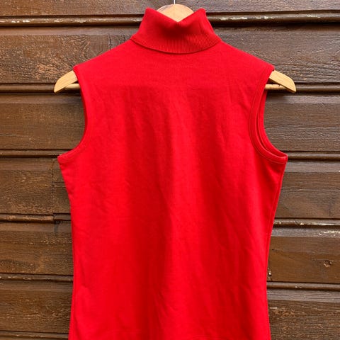 Vintage ermeløs topp med glitter og halvhøy hals fra Sparkz. Dyprød mot mørkrød farge. Sølvfarget glitter som drysser litt. Den er merket str. L, men vil si liten L, passer også M - 38/40 (se mål). 92% Polyester, 8% Elastane.