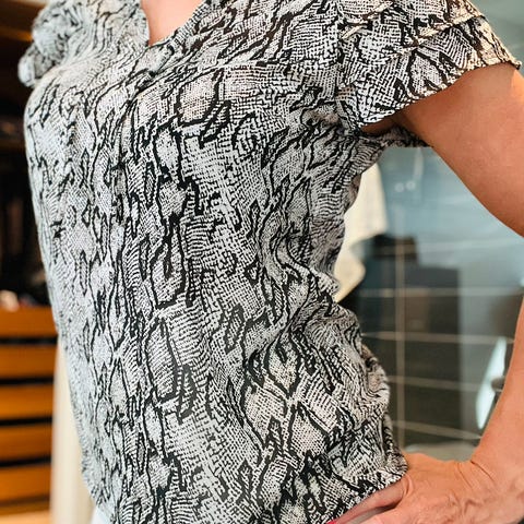 Pen topp, korte ermer og rund hals. Brukt 2 ganger. Uten bruksmerker. Svart og grå/blått mønster.