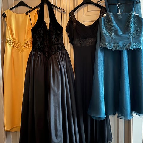 Vakker kjole med korsettliv og tilhørende sjal. Farge grågrønn/sjø. Stroppene i skulder kan taes av.