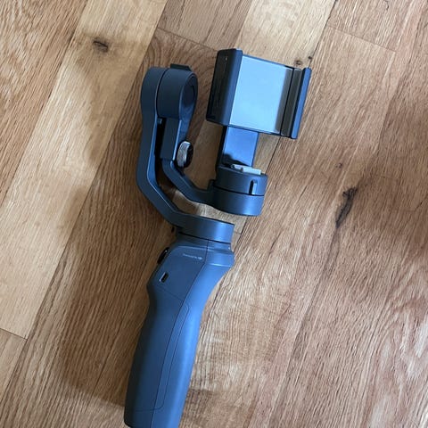 Pakken på bildene inkluderer håndtak med gimbal og kamera, mobilholder/feste for smarttelefon samt flere DJI-batterier med lader. Utstyret er egnet for håndholdt filming, vlogg, reisevideo og andre situasjoner der stabiliserte opptak er ønskelig.