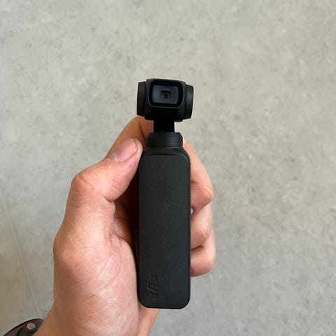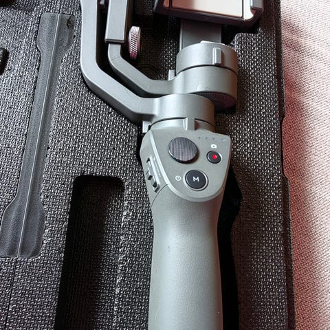 DJI Osmo håndholdt kamera med integrert gimbal. Enheten har ergonomisk håndtak med kontrollknapper og innebygd stabilisering for jevne videoopptak. Kameraet er montert i en motorisert 3-aksers gimbal.