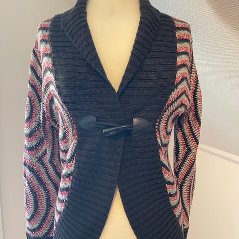 Long strikket cardigan fra Desigual. Fikk den som gave fra Spania og brukte kun et par ganger. Fin blå farge og pene detaljer.