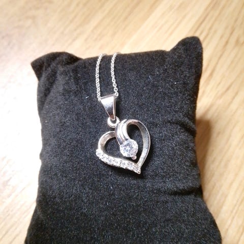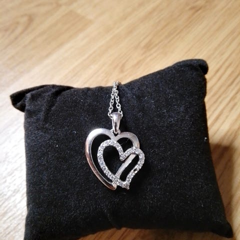 Lite brukt hjerteformet smykke i sølv med diamant. Selges da det ikke blir brukt. Fin konfirmasjonsgave