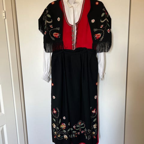 Fin Løland bunad str 38 - 40 med rød vest selges. Sølv fra Otteren er inkludert. Uten lin-skjorte. Lite brukt.