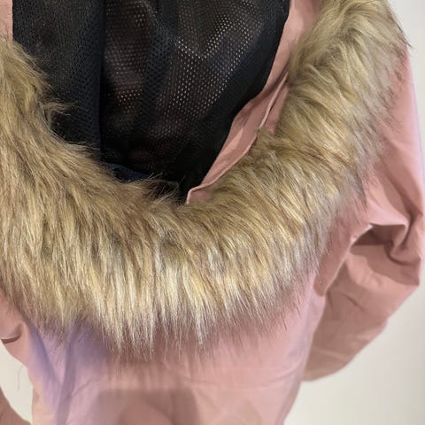 Regnjakke fra KappAhl , svart/rosa str 134/140, brukt et par ganger. Et merke på arm nede og et på andre arm, se de to nederste bildene.