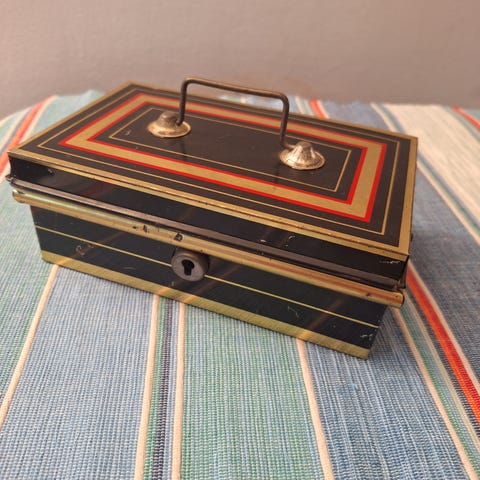 Gammel pengeskrin med brukssporer, men virker fortset. Nøkkelen inkludert..