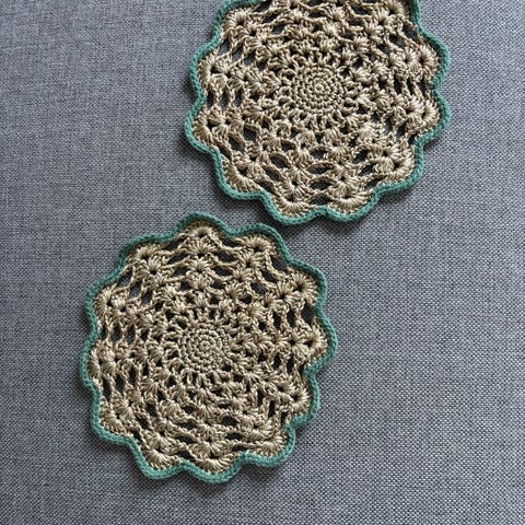 Heklet av min mor tidlig på 90 tallet eller slutten av 80 tallet. Vintage! Vært brukt som dekor i vitrineskapet og ligget nedpakket. Fint som telys, vase eller krusbrikke/duk.