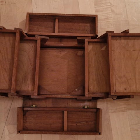 Det hengslede, skrånende rektangulære lokket som omslutter et montert interiør med forgylt verktøy i svart skinn, ebonisert pennetrau, stempelboks, det hemmelige rommet under skinnklaffen inneholder to bittesmå skuffer, nøkkel .