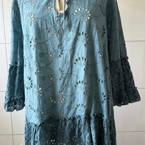 Selve størrelseslappen er dessverre klippet av, fordi den syntes, men størrelsen skal være 36/38. Lengde ca 105 cm. Livet er ca 37 cm fra "side til side" når man måler og kjolen ligger flatt, se siste to bilder med målebånd.
