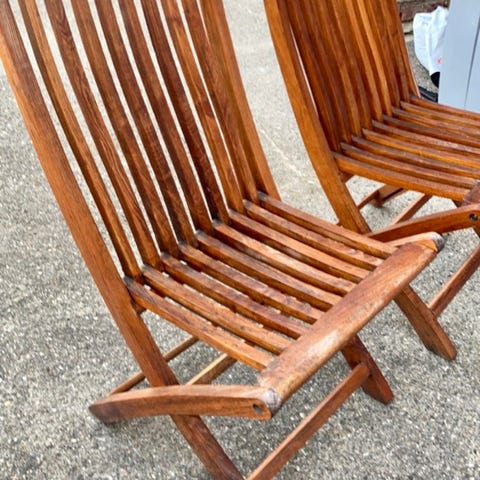 4 hagestoler m/grønne, tykke puter.. Fine og lite brukt. Teak uten armlener.