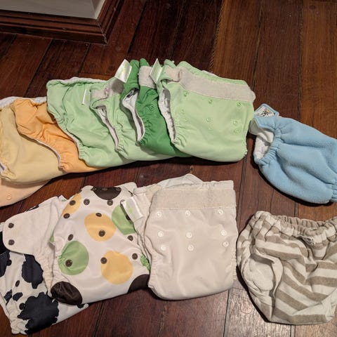 Bleiene er kjøpt nye av meg. Bleiene er kun brukt i en kortere periode. Strikkene har fått lide av møte med 90 graders vask, da dette var de første bleiene jeg kjøpte og jeg var nybegynner i tøybleievasking.