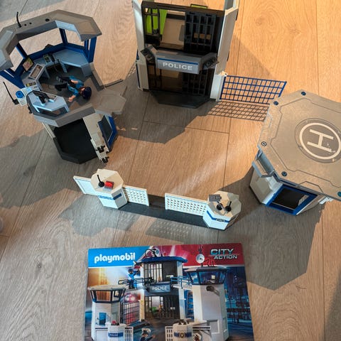 Politistasjon med politibil og politimotorsykkel, redningshelikopter, ridder og tårn. Playmobil menn medfølger.