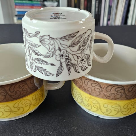 Marta - frokostservise til seks fra svenske Gefle. Vintage fra 70-tallet. Det er krakilering under asjettene. En kaffeskål og kopp med skår og asjett følger med, om ønskelig. Pent brukt.