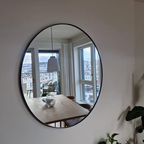 Stort rundt speil med svart ramme, diameter 110cm