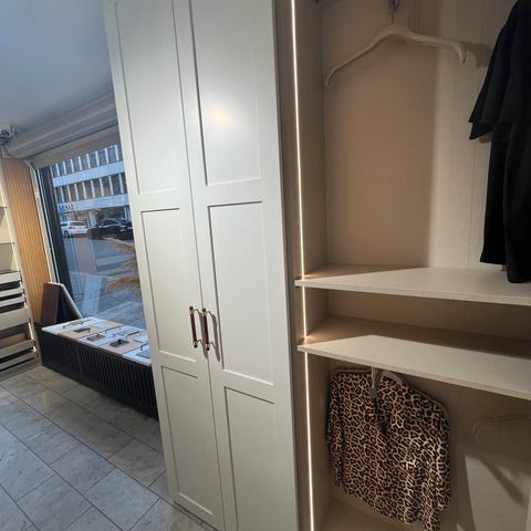 Belysning i heng, skuffer og hyller til praktisk oppbevaring.