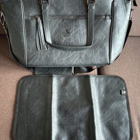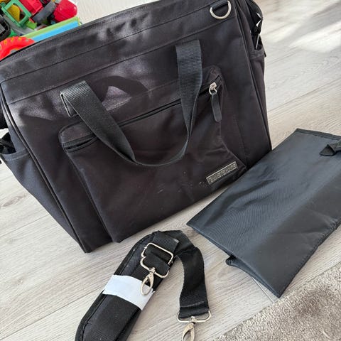 Brukt som veske men er i utgangspunktet en stelleveske med stellematte og mulighet for å henge på barnevogn.