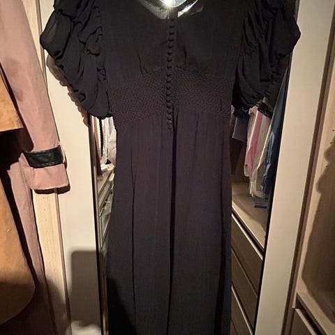 Kjolen er rød og hvit, fra Vintage stories kolleksjonen til Kappahl. Nydelig på med belte som kan knytes enten bak eller fremme, splitter i sidene nederst. Ledige ermer. Gir en flatterende figur. Oppleves stor i størrelsen, og vil også passe en medium.