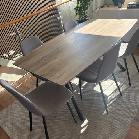 Spisebord med fire stoler. Bordplate i lyst tre med rette kanter og rette ben. Stolene har polstret sete og rygg i lys grå tekstil med horisontale sømmer, samt slanke, mørke metallben. Egnet som spisegruppe til kjøkken eller spisestue for fire personer.