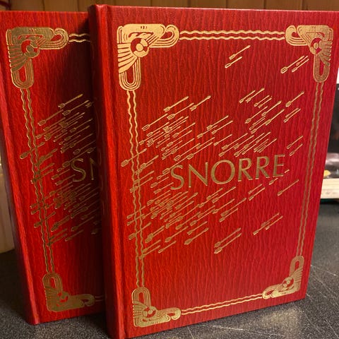 2-binds utgåve av Snorres kongesagaer. Utgitt i 1995, Utgåve frå 1979. Bind 1 har eit par sider som er litt bulka. Sjå bilde. Bind 2 er ubrukt.