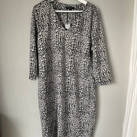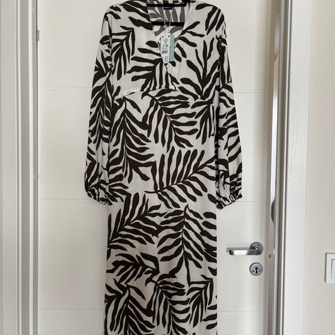 Nydelig mønster i sort på offwhite bunnfarge, kjolen er 100% viskose. Kort selskapskjole med lang arm.