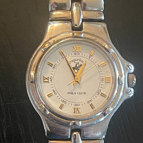 Flott US Polo hvit klokke med «diamanter» rundt urskiva. Myk slags behagelig gummireim. Ingen feil eller skader men må ha nytt batteri. Selges Kr 90.. Kjøpt i USA. Kan sendes kjøper bet porto evt avtale overlev Oslo. Har Vipps. Dyr og røykfritt hjem
