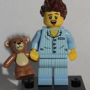 Lego minifigur fra Series 20, 71027. Pajama Girl med kosedyr, en kosekanin. Ny, aldri montert eller lekt med. Pakket rett i ziplock pose. Utgått fra Lego. col20-15 Complete Set with Stand and Accessories.