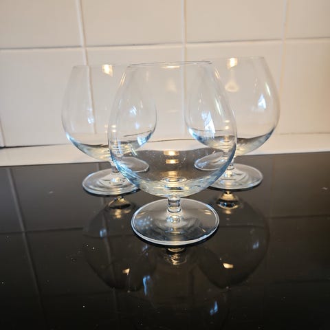 Tre cognac-glass med fin klang. Høyde 130 mm, volum ca. 35 cl.
