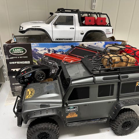Traxxas slayer pro 4wd lite brukt med div ekstra hjul og tilbehør. EZ starten mangler bak deksel og start knappen sitter fast i start posisjon. Batteri til glødeplugg og EZ start synger på siste verset de de begynner å bli gamle.