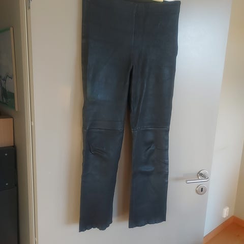 Sort skinnbukse fra Jofama, str 38, meget pent brukt. Ingen riper el skader. Mykt skinn og kjempefin passform, med fine detaljer.