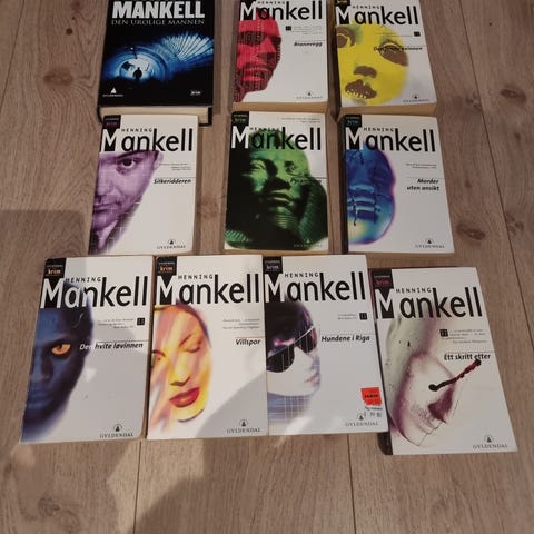 Krimbøker og romaner av svenske Henning Mankell selges. Alle bøkene er innbundet og pent brukte. Selges for 25 kr per bok.