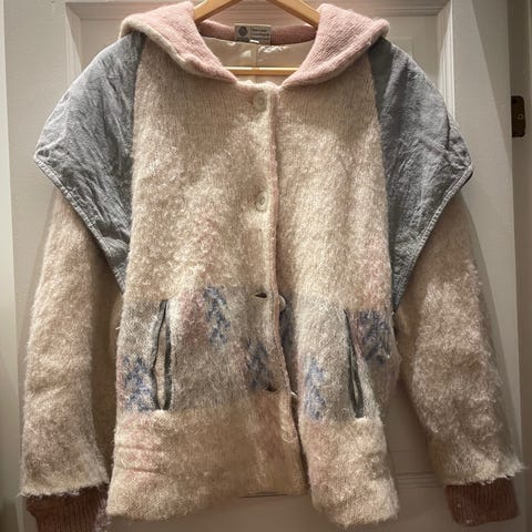 Ulljakke i flerfarget design, størrelse L for dame. Modellen på bildet er 174 cm og bruker L. Jakken har mønsterdetaljer og er laget av ullmateriale. Passer til bruk som ytterplagg i kjølige forhold.