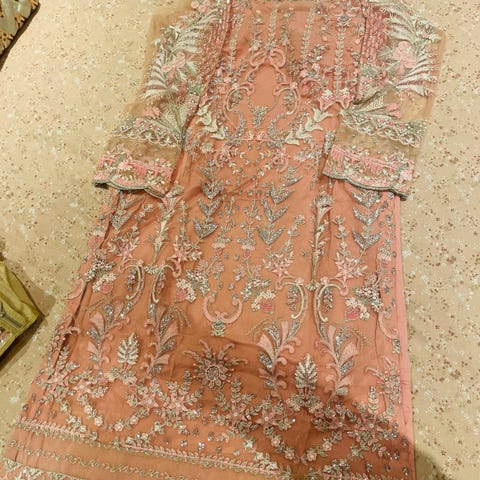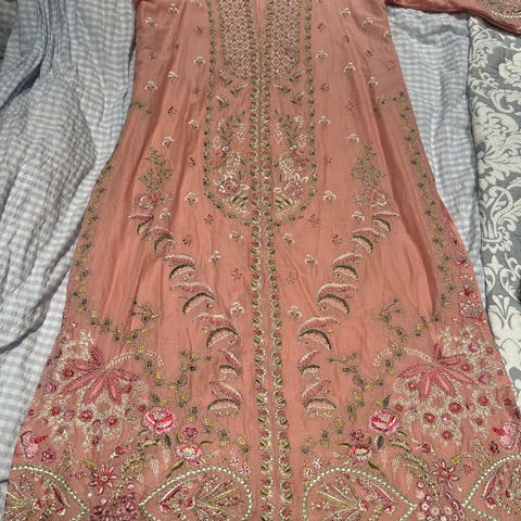 Kjole, pakistansk, pyntet kjole med bukse og sjal