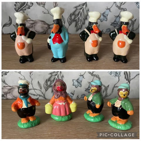 6 ender i keramikk. Høyde 10 cm. Hele og fine.