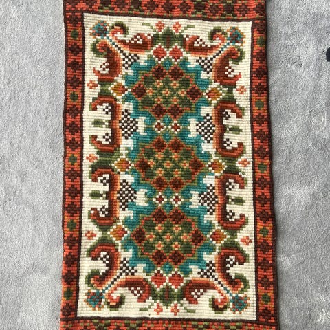 Håndsydd veggteppe med smijernsbeslag oppe og nede
