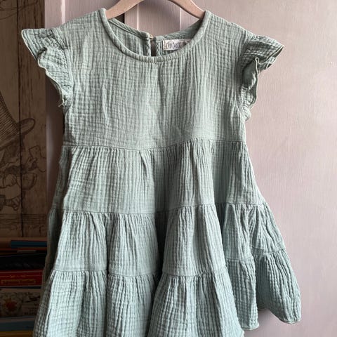 Pent brukt, som ny. 55% bomull og 45% lin. Fine detaljer med hull oppå skuldrene, se bilde 3. størrelse 122.