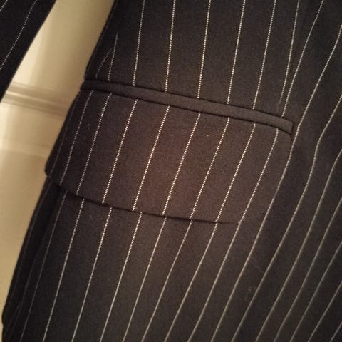 Stilig mørk brun dress fra Mexx. Bukse str 36 og jakke str. 38. Mange flotte detaljer både på bukse og jakke. Bukse har 2 sidelommer og 2 baklommer og 1 lomme på låret. Belte følger med. Ankellengde med snøring. Jakke har 4 lommer og belte og trykknapp lukking. Fargen på bildene fremstår ganske feil, er en nydelig mørkebrun farge.