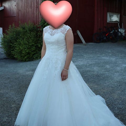 Kjolen er størrelse 38, bruden bruker 36 til vanlig, og kjolen opplevdes litt stor i overdelen selve bryllupsdagen. Kjolen er sydd opp til å passe mine 171 cm med ca 5 cm hæl. Kan enkelt tilpasses hos skredder på ny for å passe en ny brud.