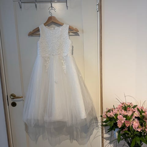 Denne kjolen er bare så nydelig. Brukte bare en gang av min datter i forbindelse med hennes første kommunion som varte 2 timer. Kjølen fremstår som nye, med fine detaljer på plass.