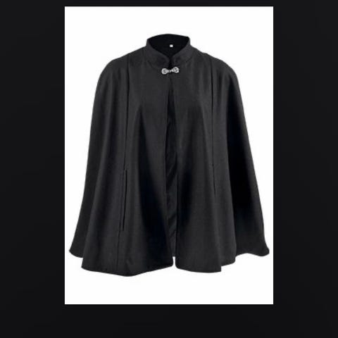 Kjøpt i motebutikk i Hgsd. Spensel bak som kan knappes av. Like fin til bukser, skjørt, lange gensere. også til bunader. Splitter i sider for armene. En pyntefold foran ved ermesplittene. Stoffet har fin tekstur med 60% ull i stoffet. Sidde fra nakke og ned ca 62 cm. Halsomkrets ca 51 cm. Skulderbredde fra skuldersøm til skuldersøm ca 43/44 cm. Merket str 42. Kan muligens brukes av str 38. Brystvidde omkrets ca 127 cm rund, Den er målt ca 25 cm ned fra hals. Capen har ikke armer, og stikkes ut fra åpen splitt i hver side. .Foret med blomstret forstoff. Knappene er fine. Jevn sort farge. Ingen skjolder.. Året rundt cape, og fin til festdrakten.
