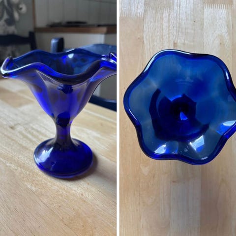 Til salgs elegant håndlaget flerfarget glass, ideelt for servering av dessert, uten sjetonger eller sprekker.