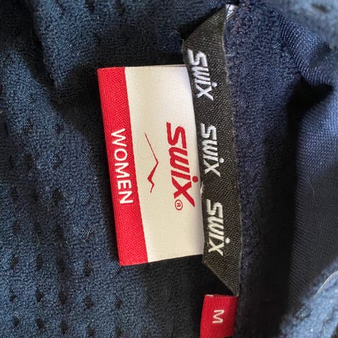 Flott Swix-genser til dame selges rimelig. Str. M. 100 % polyester. Et par trådmerker vannrett på baksiden etter bruk, men ingen hull eller skader.