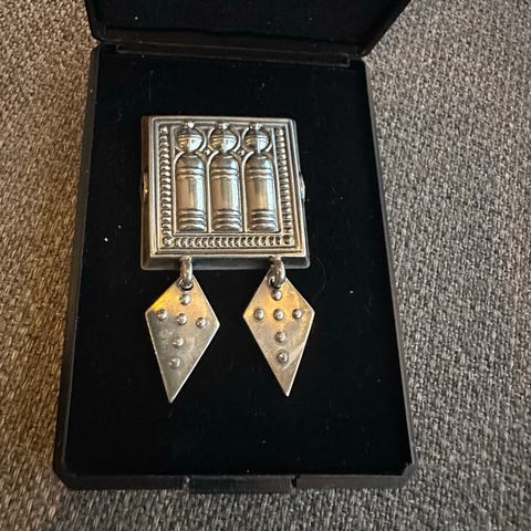 Nye håndlagede ørepynt ( Brendemo sølv& gull) med stavkirkemotiv .( ca 3 cm lange).Kan også sendes som brev.