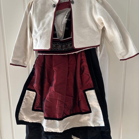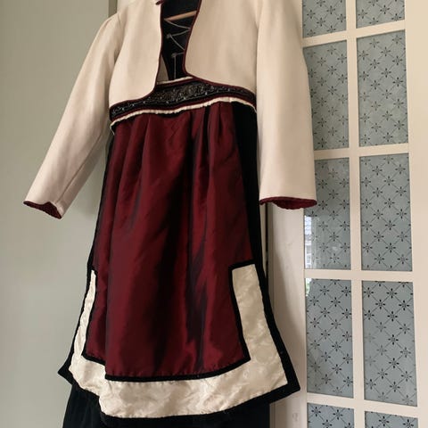 Nydelig bunad med offwhite jakke i ull , helfòret...+ forkle . ca. Str. 12 år. ( 152 )