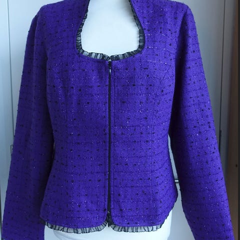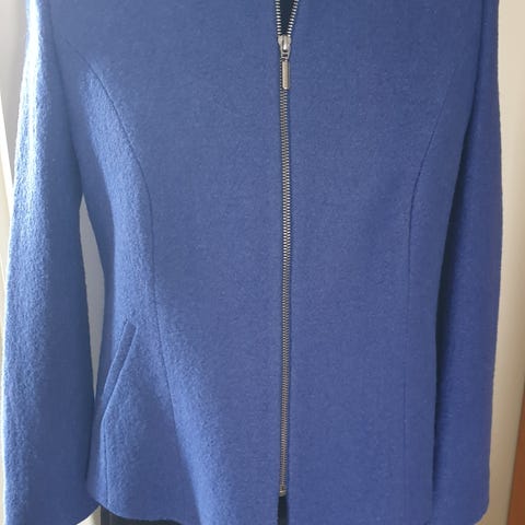 Lite og pent brukt jakke str. L med glidelås. Den er i mellomblå farge. 62,5% viscose og 37,5% polyester.